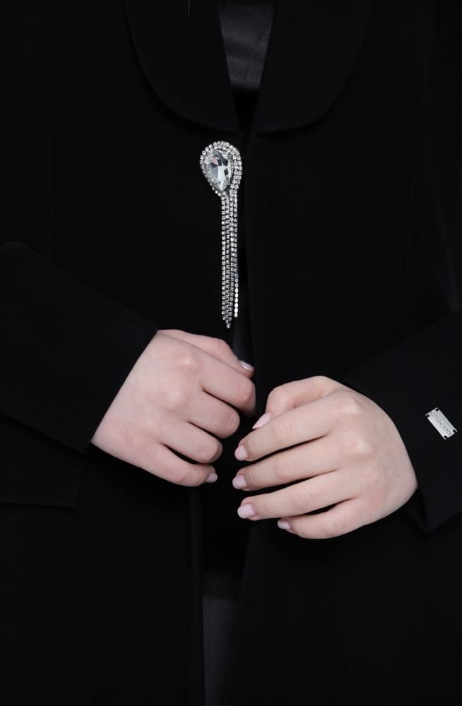 القصّة بليزر من الأعلى وتنتهي بنصف كلوش من الأسفل تمنحها حركة ناعمة وفخامة متزنة.