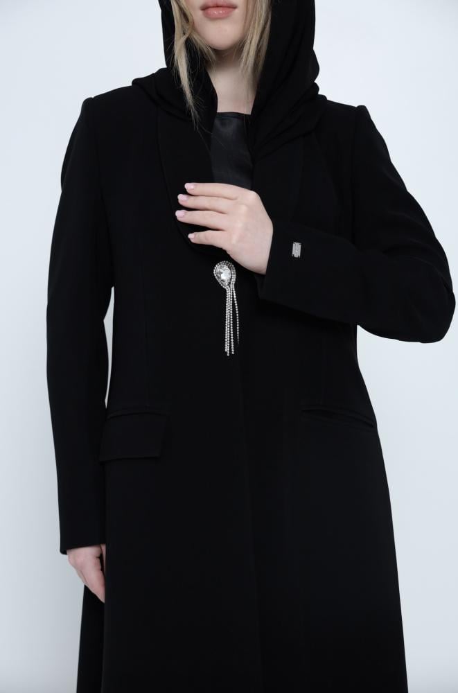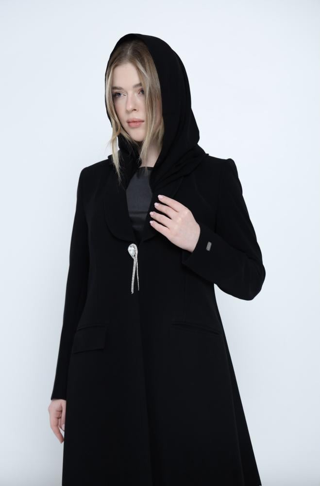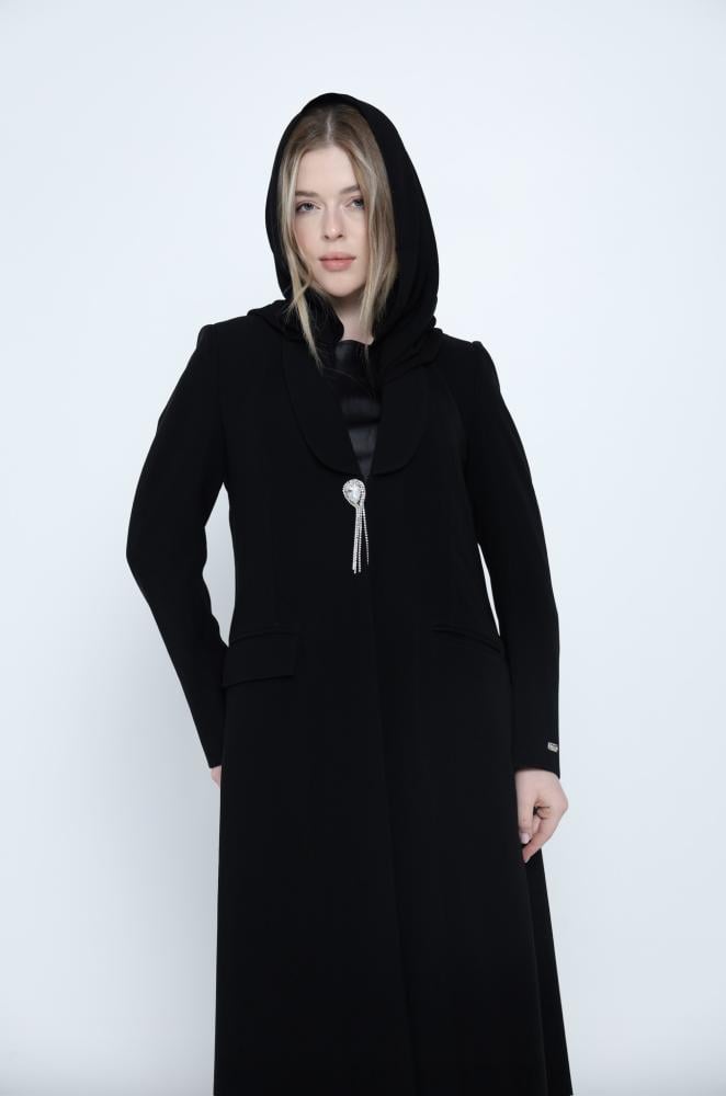 عباية فاخرة بتصميم بليزر أنيق، مصنوعة من قماش كريب ملكي أسود فاحم راقي، لا يشف ولا يُبرز تفاصيل الجسم.
