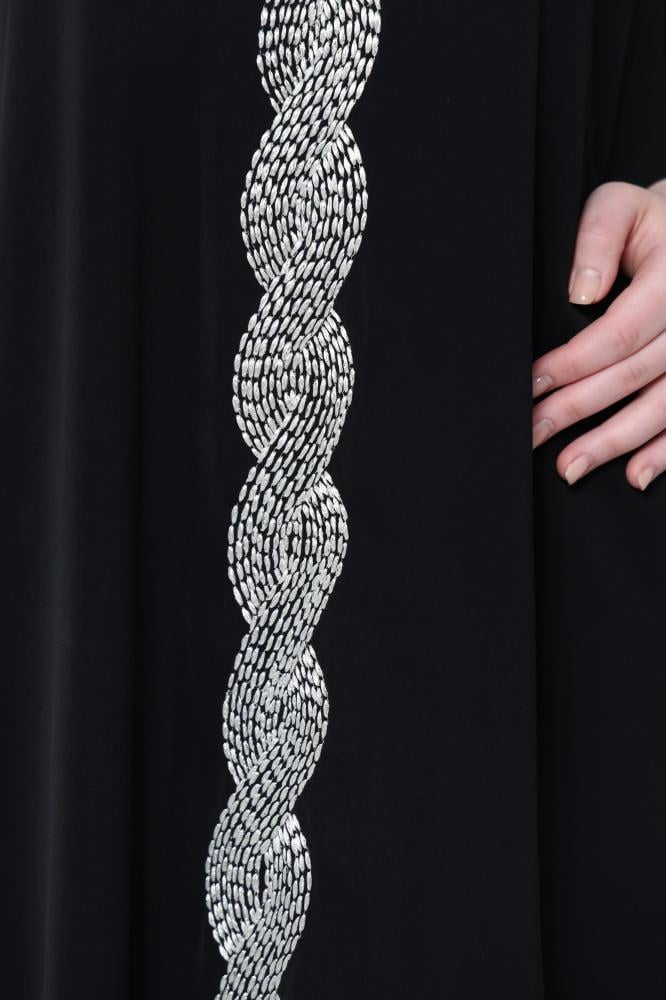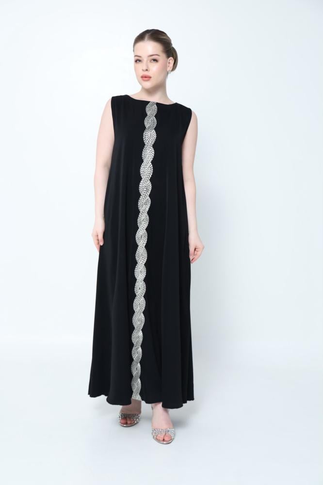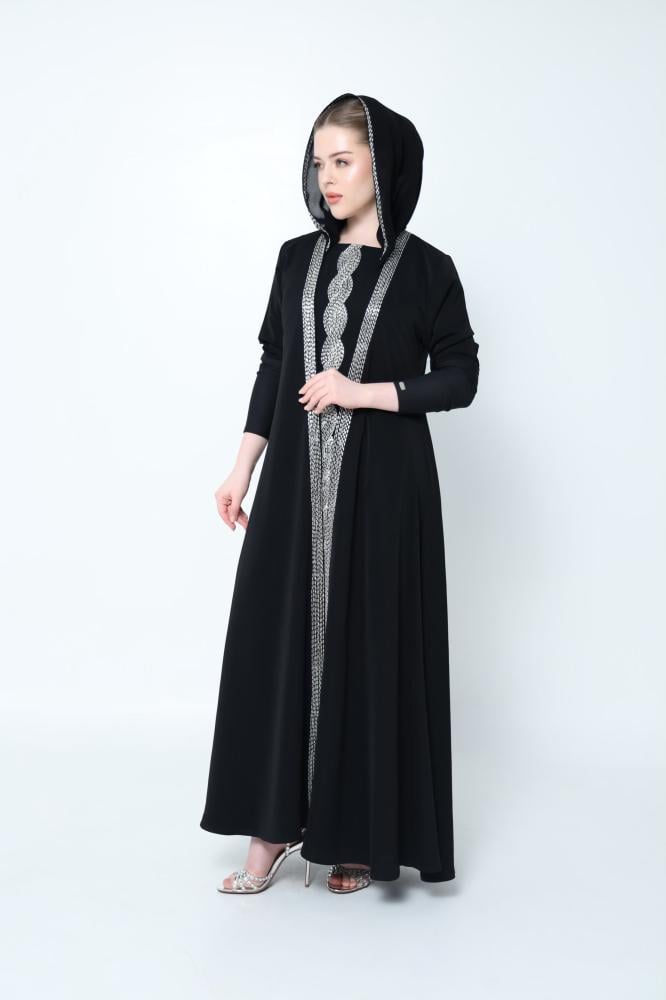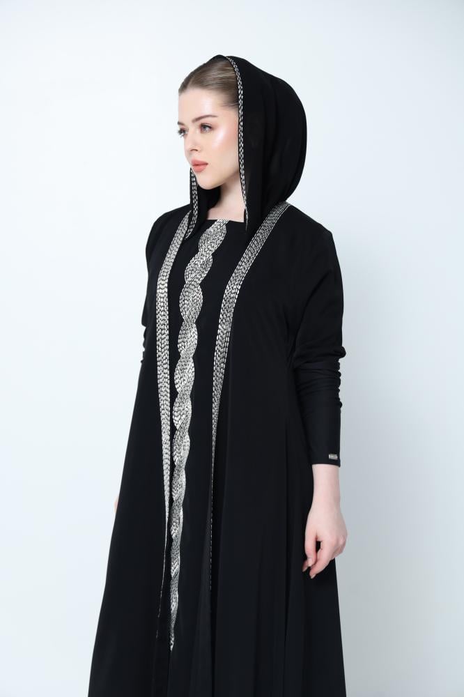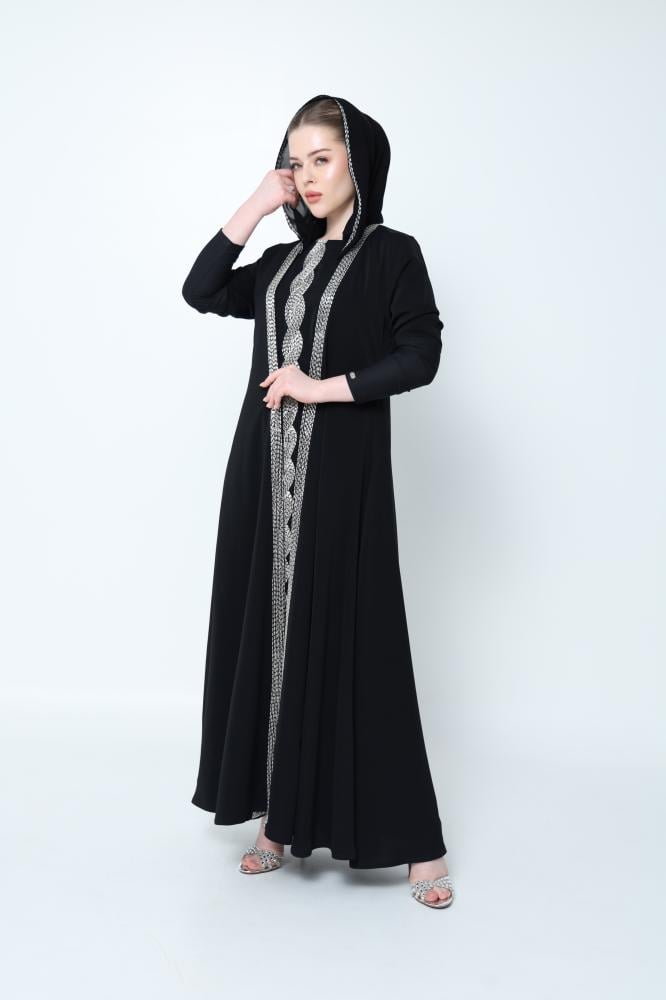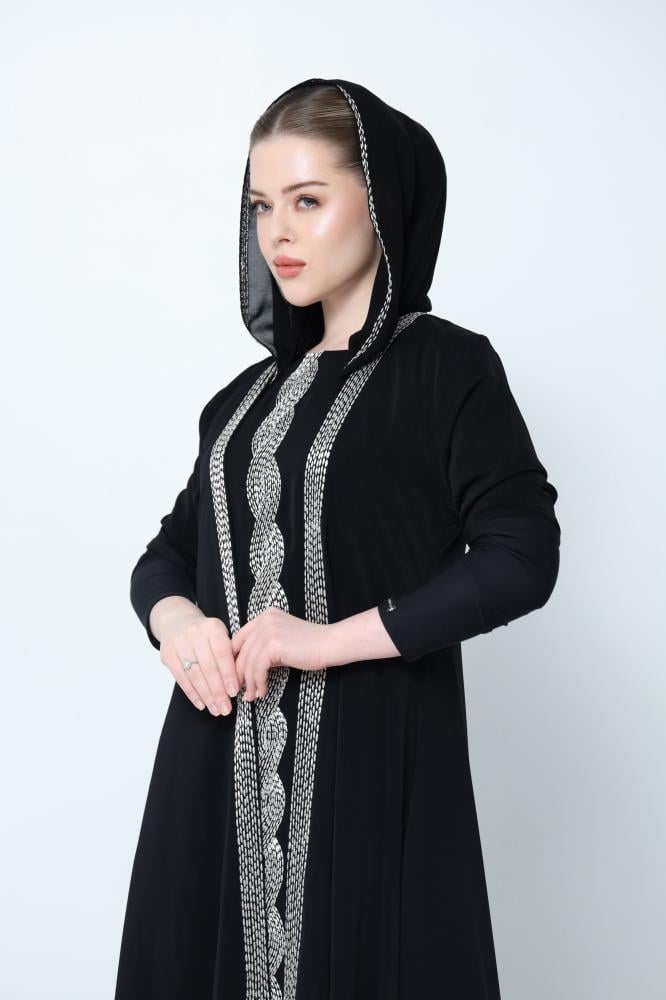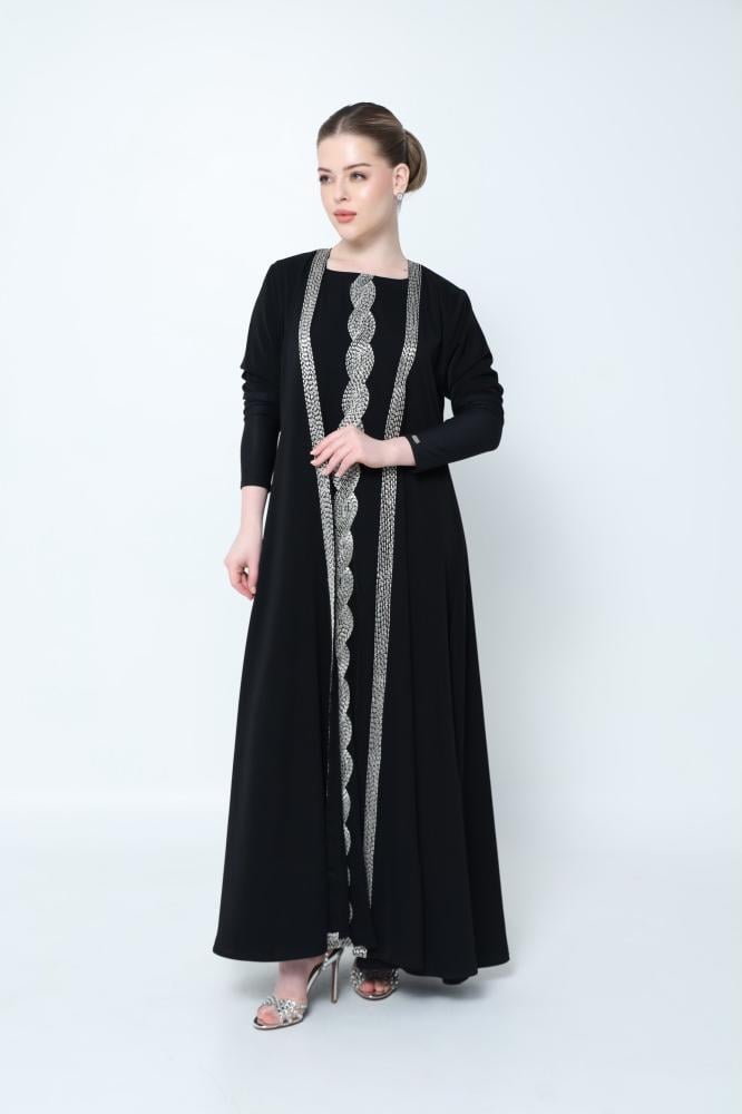 عباية بقصة كلوش واسعة وانسيابية، مصنوعة من قماش خفيف جداً وناعم يمنح راحة وأناقة في اللبس. تتميز بأكمام ستريتش عملية مع تصميم دبل كلوش يضفي لمسة فاخرة. تأتي العباية مع فستان وطرحة مطرزين يدوياً بدقة عالية، لتمنحك إطلالة متكاملة راقية، باللون الفاحم الأنيق
