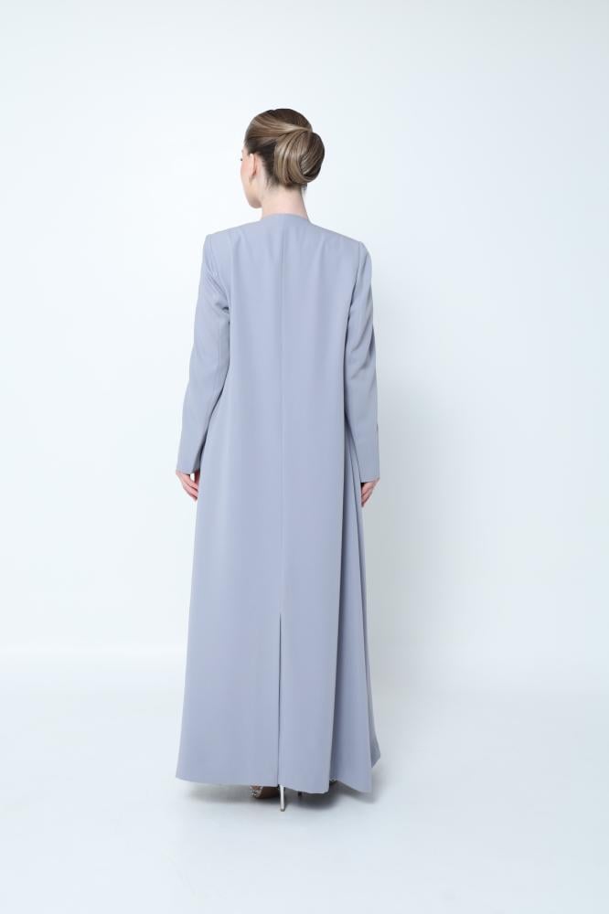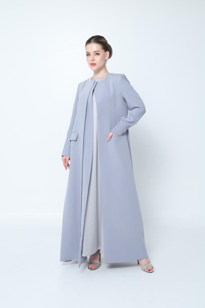 عباية بليزر راقية بلون بيبي بلو من قماش الكريب الفاخر، تتميز بقصة حرف A تضفي طولاً وأناقة. صُممت بكتافات خفيفة وبطانة داخلية لراحة أكبر، مع جيبين أماميين عمليين. تأتي العباية مع فستان داخلي من الحرير وطرحة متناسقة، لإطلالة متكاملة فخمة وناعمة في آن واحد