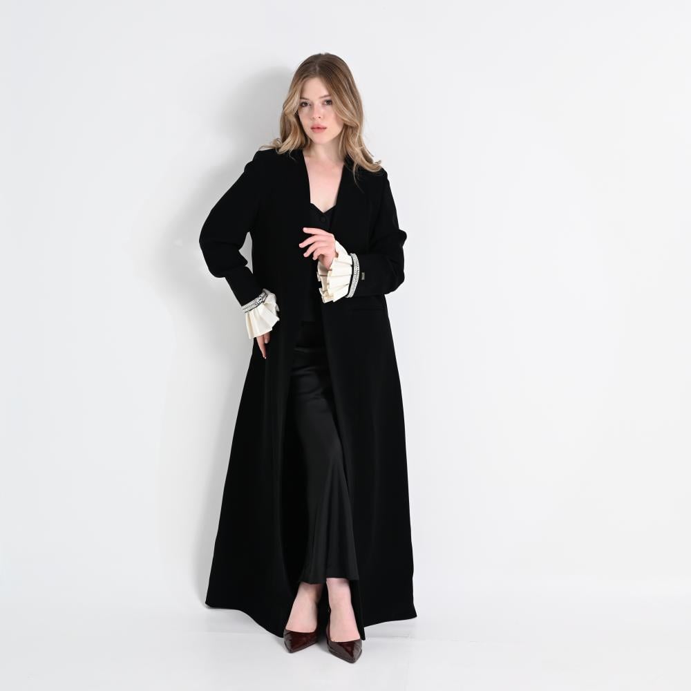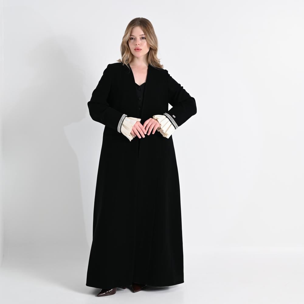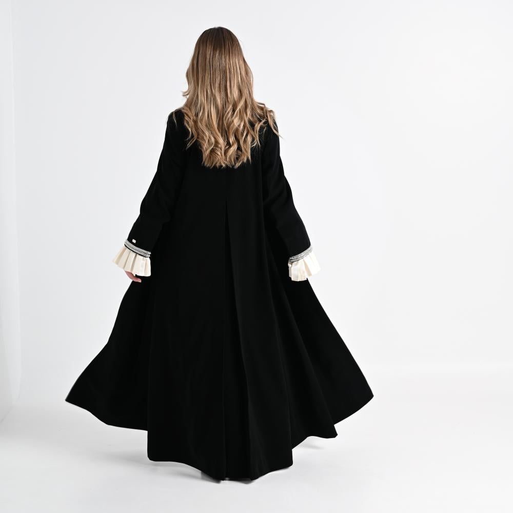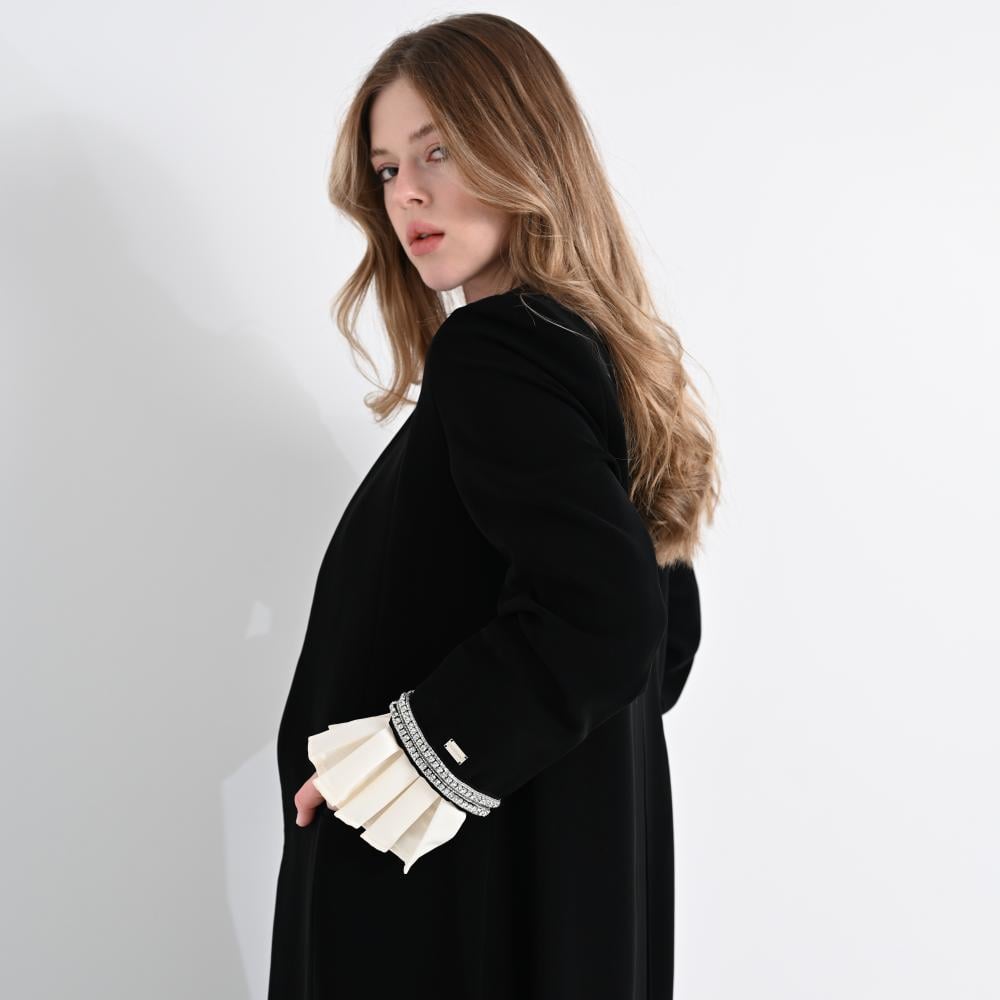 مصنوع من كريب ياباني أسود ملكي، يتميز بقوامه المتماسك وسواده الفاحم، ويُزين بتفاصيل دقيقة تضيف تميّزًا واضحًا.