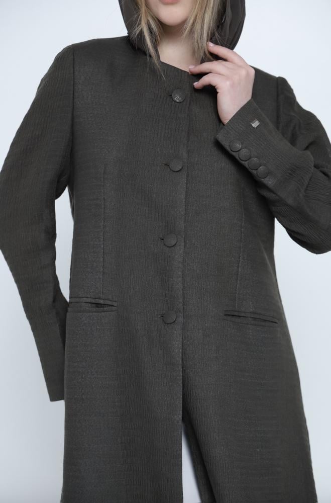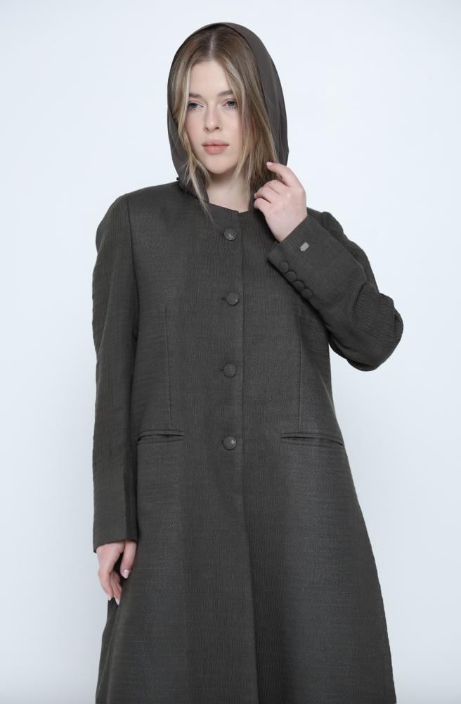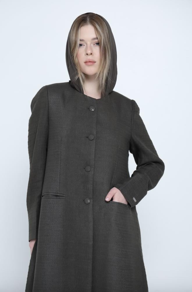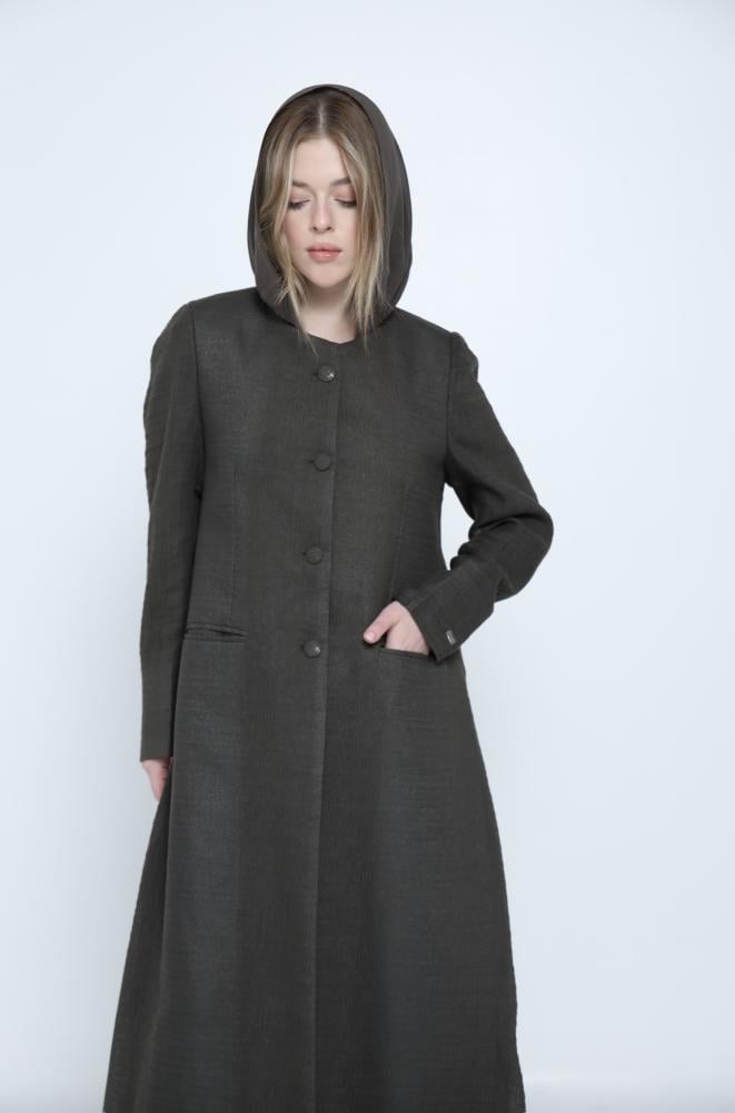 عباية أنيقة وعملية بتصميم فريد من قماش لنن زيتي خفيف جداً، مثالي لأجواء الصيف والحركة اليومية.
