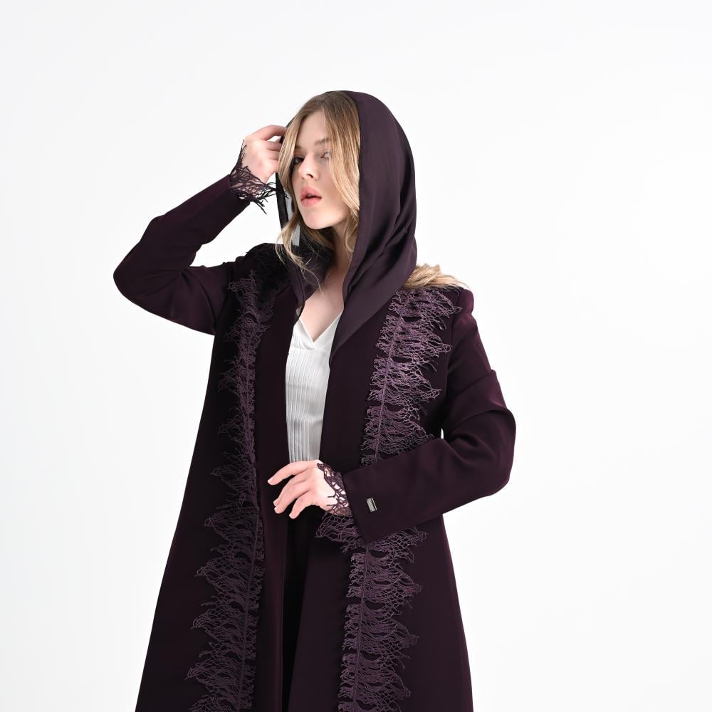 ما يميز هذه العباية هو دمج نسيج يدوي فاخر بدقة في طرفي العباية وأطراف الأكمام، ليمنحها لمسة تراثية فنية تنطق بالأصالة.