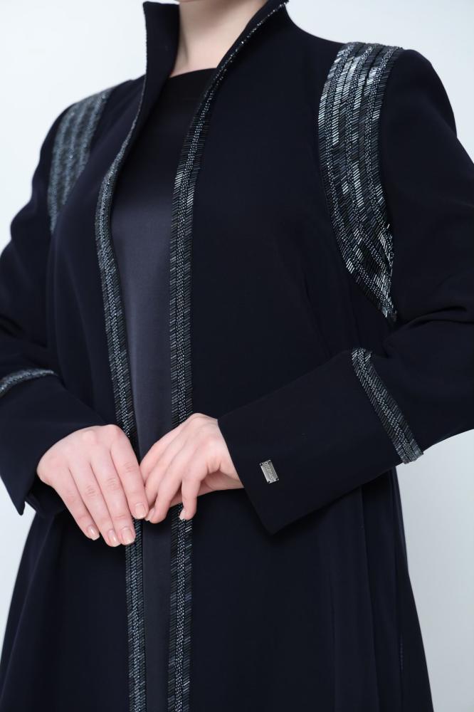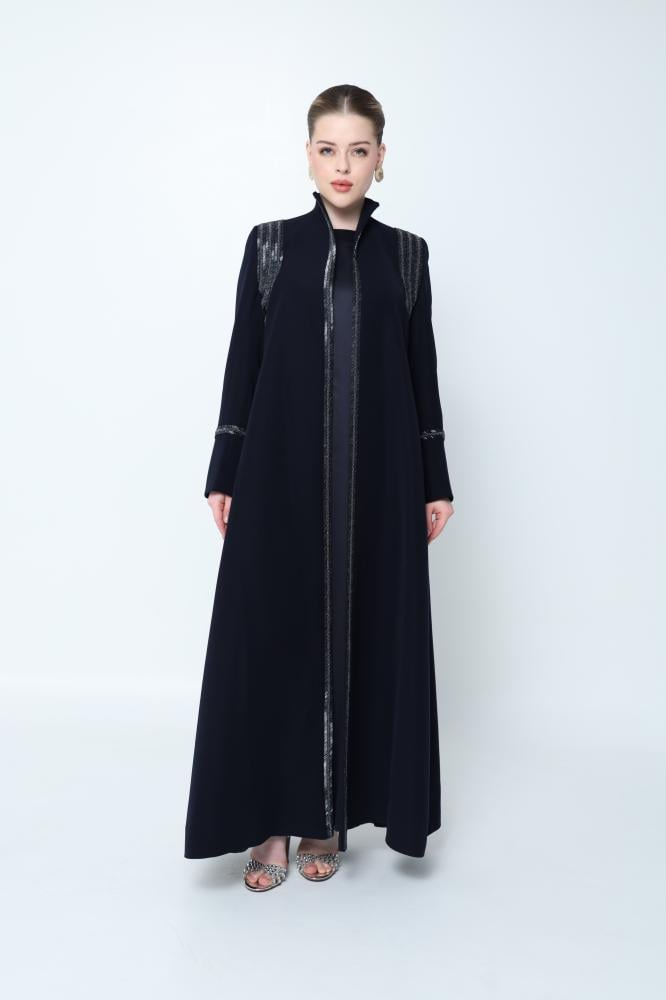 عباية بلون كحلي غامق ملكي من قماش الكريب الفاخر، بتصميم أنيق مزين بشك فاخر على الأكمام وحواف العباية الأمامية. تتميز بكتافات خفيفة وبطانة داخلية تضفي ترتيباً وجمالاً على القوام، مع جيب مخفي عملي. تأتي العباية مع فستان داخلي من الحرير لإطلالة متكاملة وراقية